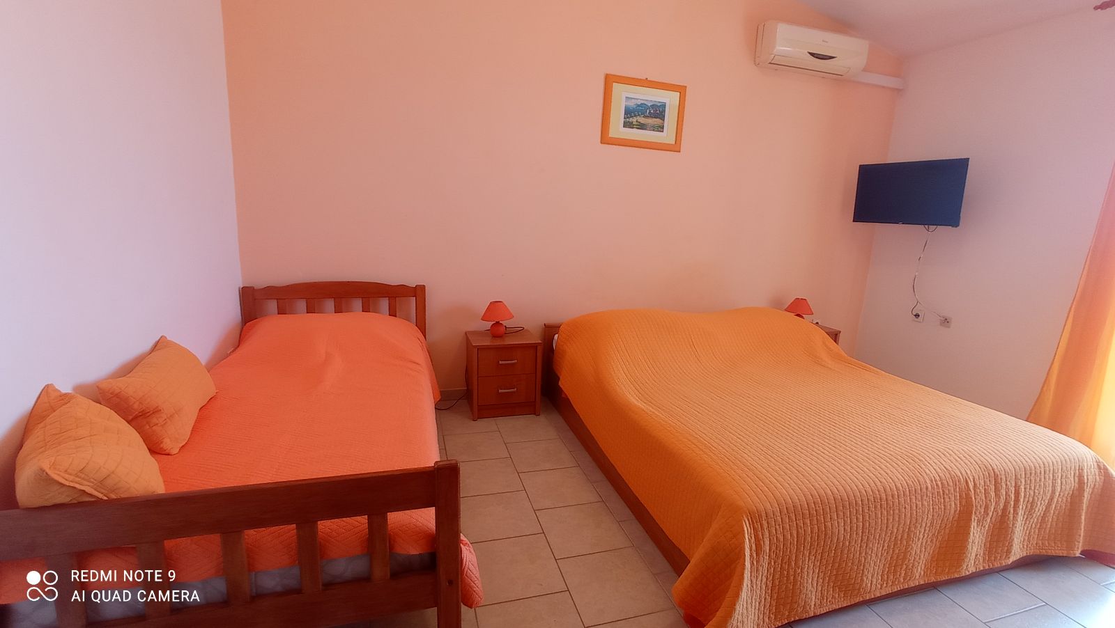 Das Appartement ist einer Miniküche, einem Dreibettzimmer mit Sat-TV und Klimaanlage und ein Badezimmer bestehend und liegt in der zweiten Etage. Die Küchenzeile beinhaltet einen Kühlschrank mit Gefrierfach, einen Herd, einen Wasserkocher, einen Toaster und eine Kaffeemaschine. Bettwäsche und Handtücher sind im Mietpreis inbegriffen. Für die Gäste ist das WLAN kostenfrei.