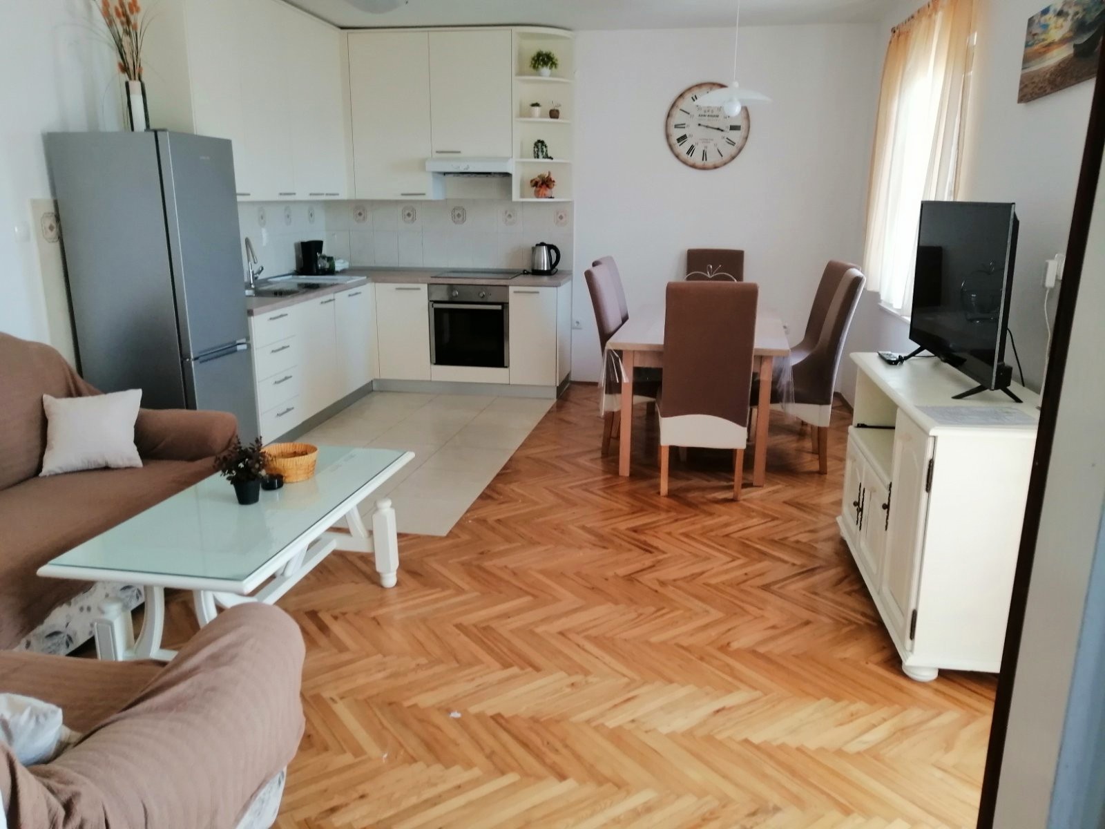 Hundefreundliche Ferienwohnung für 8 (6+2) Personen in Strandnähe in Rtina Miocici nahe Razanac in der Umgebung von Zadar verfügt über eine gut ausgestattete Küche mit Wohnzimmer, 2 Bäder und 3 Schlafzimmer. Im 2. Stock, 120 m², mit tollem Meerblick.