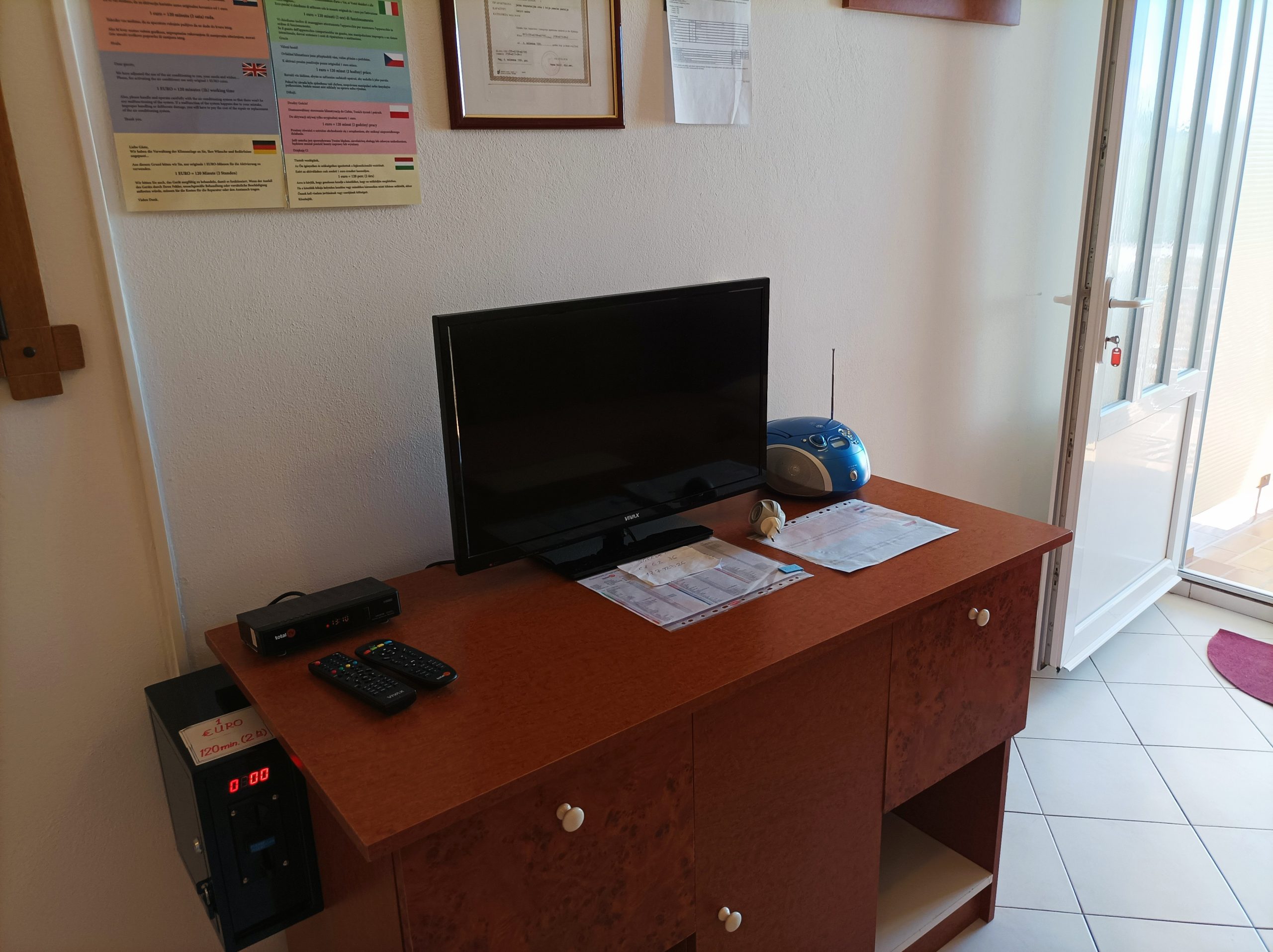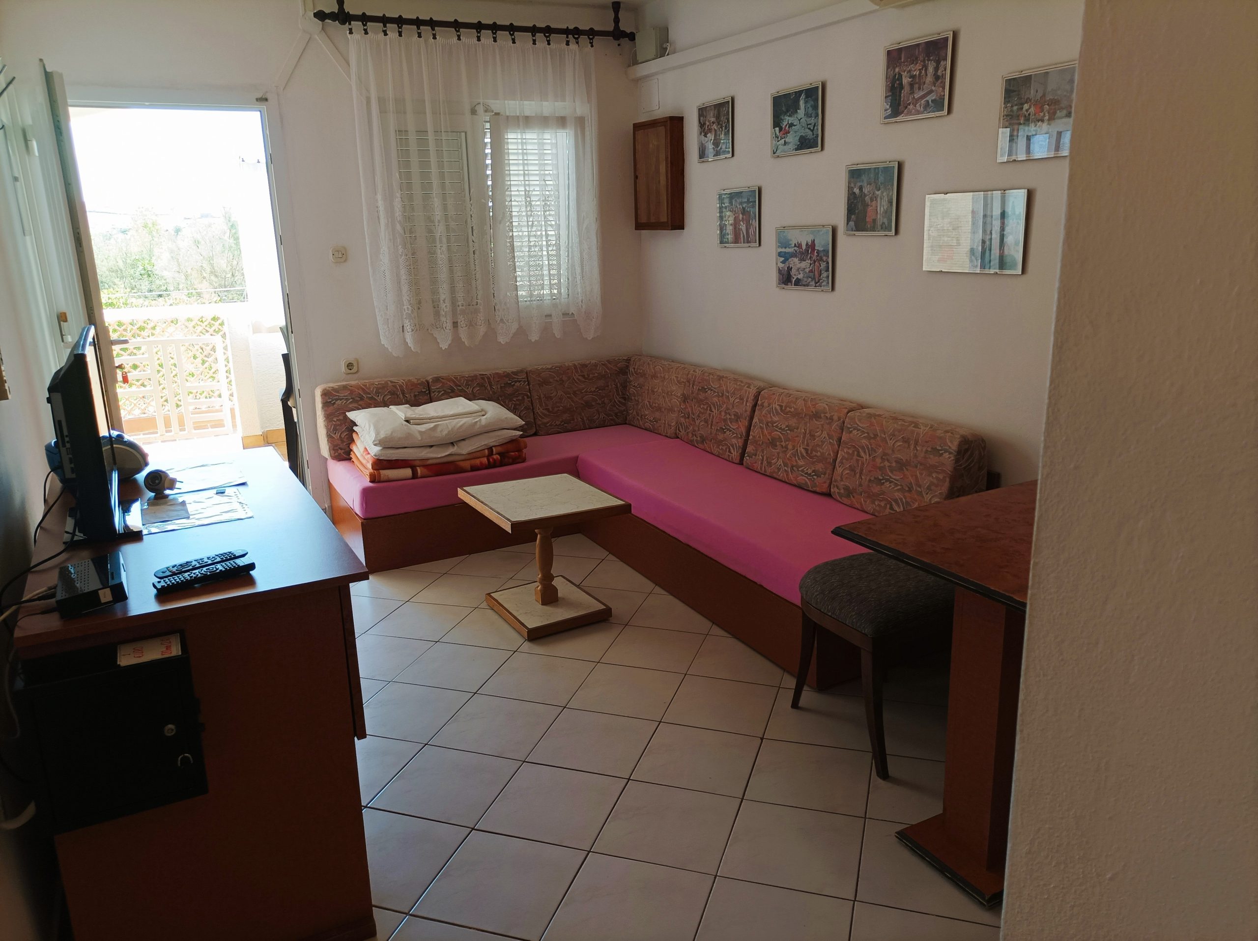 Handtücher und Bettwäsche sind auch vorhanden. Der LCD Fernseher mit eingebautem Satellitenreceiver ermöglicht Ihnen, viele TV Programme in mehreren Sprachen zu schauen. Für zusätzlichen Komfort können Sie die Klimaanlage und kostenloses WiFi genießen. Für die Nutzung der Klimaanlage wird 1 € pro 2 Stunden berechnet.